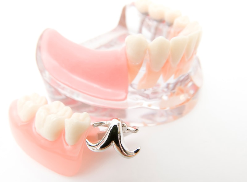 部分入れ歯は、数本抜けた歯を補います。両隣の健康な歯に金属バネをかけて支えにするため、支えとなる歯のこまめなメインテナンスが欠かせません。