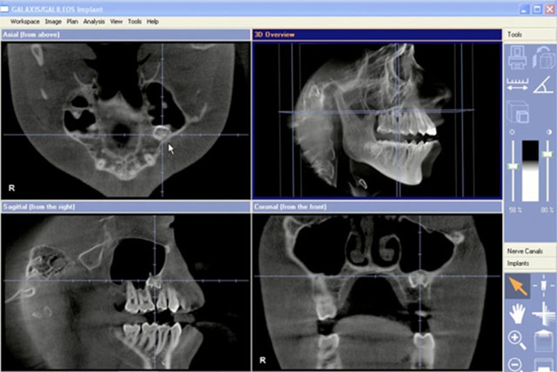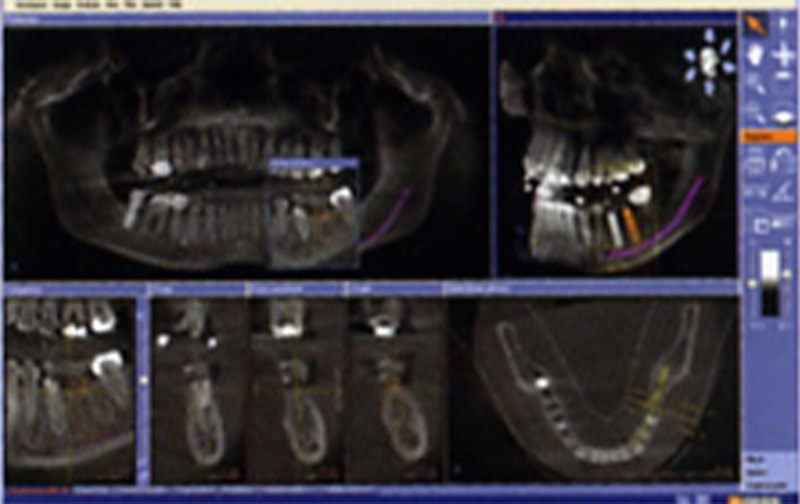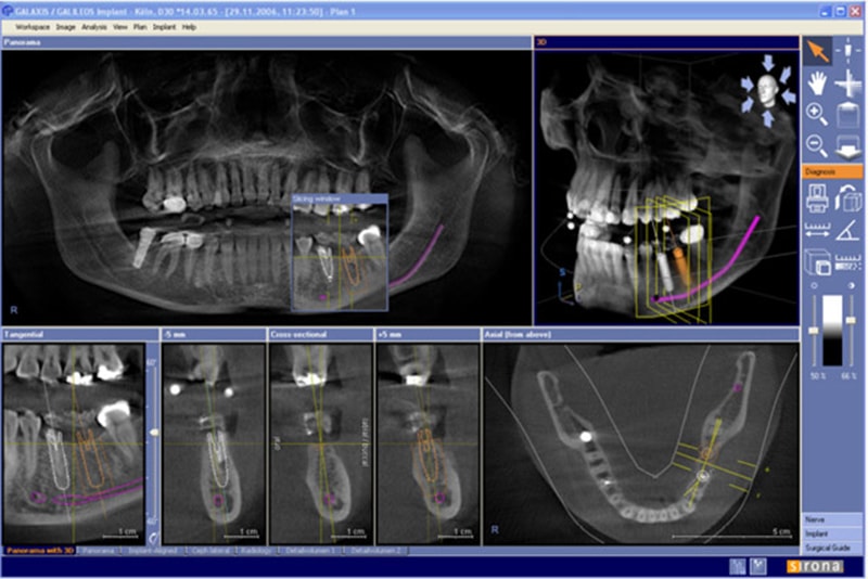 ②撮影された画像を元にGALILEOS Implantソフトウェアでインプラント・プランニングを行います。(下顎管のトレース、インプラント・フィクスチャーの調整等。)