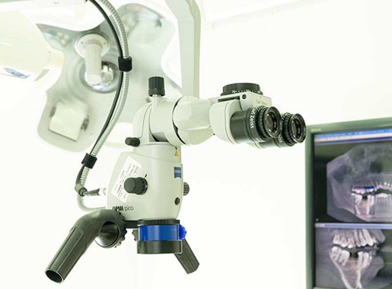 当院で導入している「OPMI pico」は、歯科専用として開発された手術用顕微鏡で、世界的医療光学機器メーカー「カール ツァイス メディテック社」製。性能だけでなくデザイン的にも優れ、世界的に評価の高い顕微鏡です。光学系には3色の色収差を補正し、優れた光透過率を誇る、Tマルチコートアポクロマートレンズを採用しています。