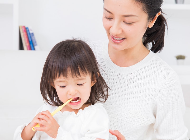 また、小児歯科で高濃度のフッ素を塗布すれば何倍もの相乗効果が得られ、強力な予防対策になります。糖分があまり多くないデザートやおやつを与える工夫も虫歯予防に有効です。